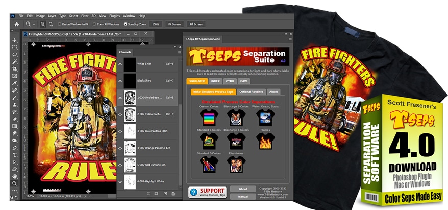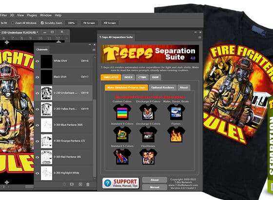 Users can create artwork in Adobe Illustrator, Photoshop, or CorelDRAW, then process files in Photoshop with T-Seps.